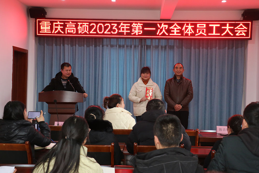 律回春晖渐,万象始更新。2月7日下午,重庆高硕2023年首届员工大会在公司二楼会议室成功召开,会议由总经办助理黄小波主持,重庆高硕总经理郭强、厂务厂务部陈吉林厂长、行政部副总经理陈月玫分别对2022年度的各项工作进行了分析与总结,并对2023年的工作予以部署。本次会议,是重庆高硕2023年度的第一场员工大会,也是产业发展的全新启航,对未来发展有着重要的意义。