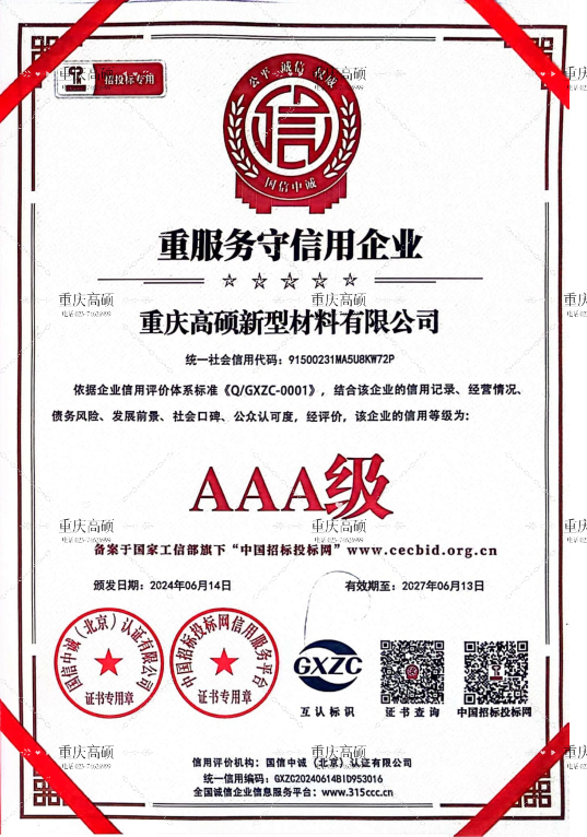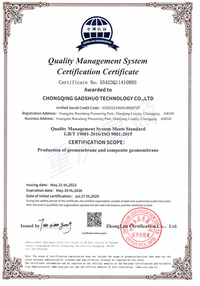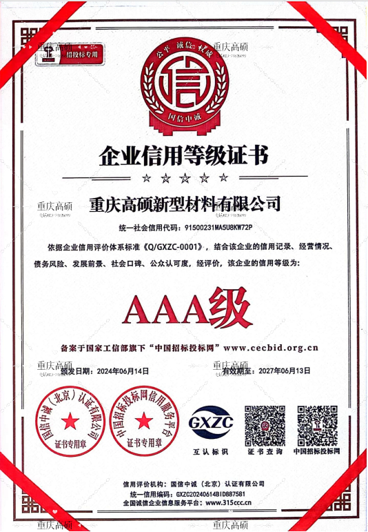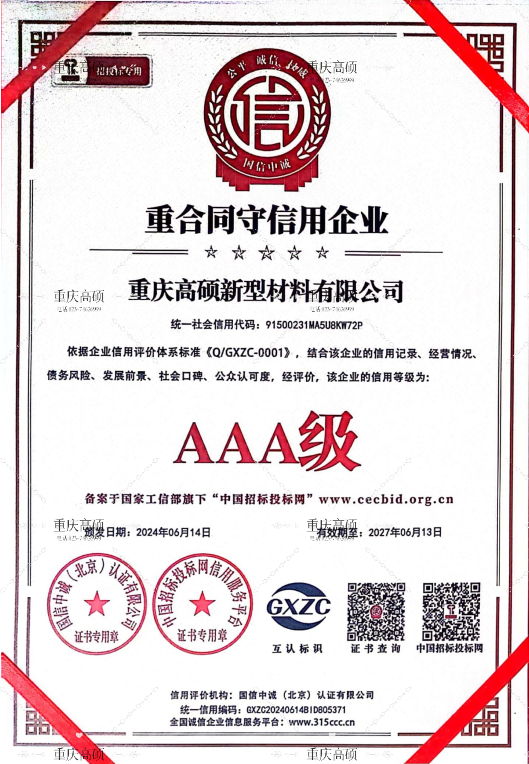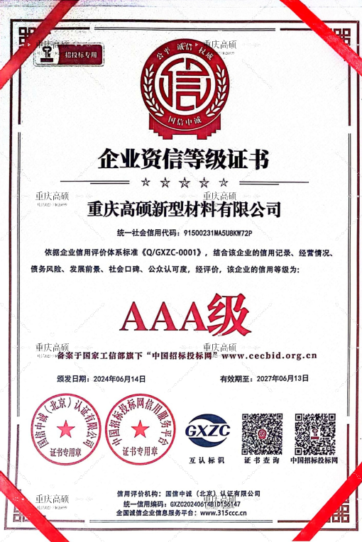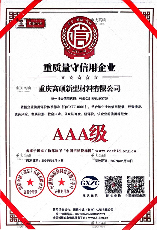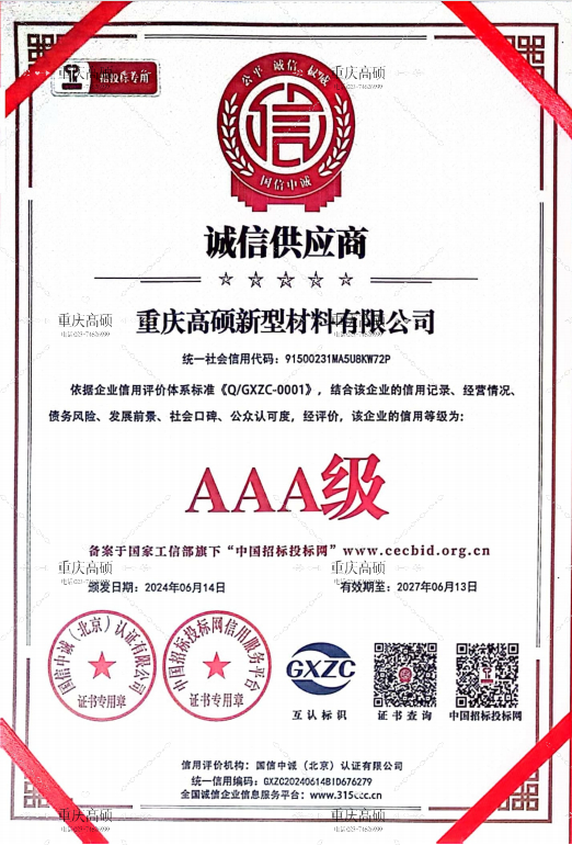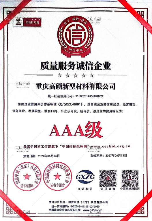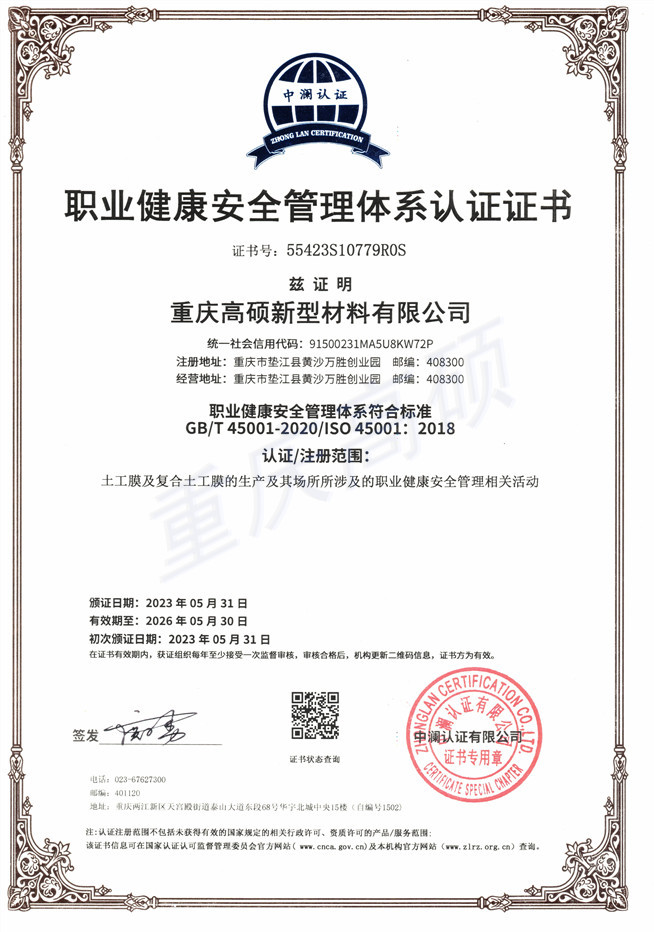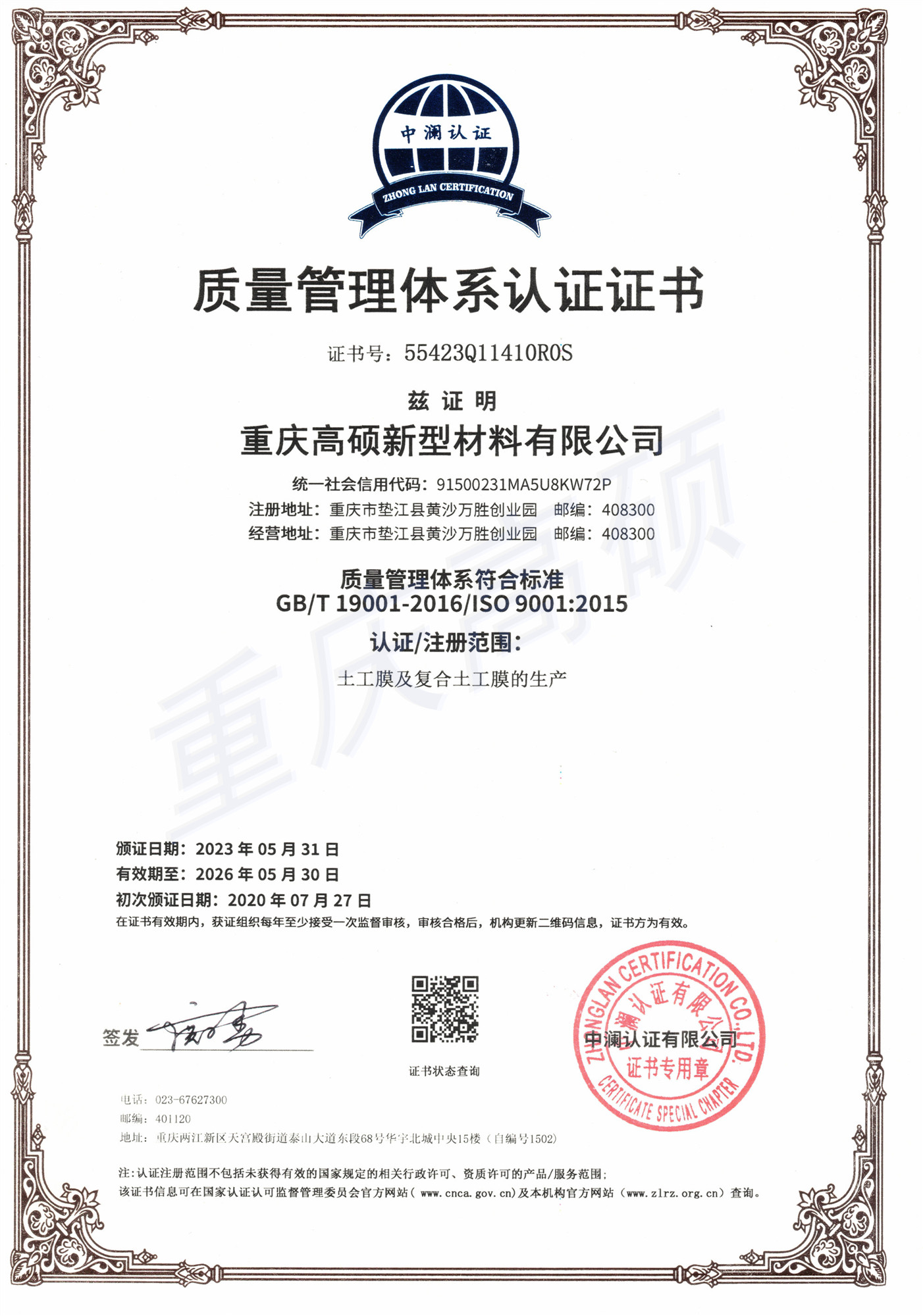 重庆高硕是中国土工合成材料工程协会理事单位,先后获得国家高新技术企业、重庆市专精特新中小型企业、质量诚信标杆企业、AAA级守合同重信用企业、AAA级企业诚信示范单位、AAA级质量服务诚信单位等荣誉,公司通过“ISO 9001:2015质量管理体系认证”、“ISO 45001:2018职业健康安全管理体系认证”、“ISO 14001:2015 环境管理体系认证”,高硕品牌享有较高的知名度和美誉度,致力于打造一流的创新、研发、设计、生产、应用资源共享平台,为广大客户提供优质的产品和全方位的售后服务以及一体化解决方案。