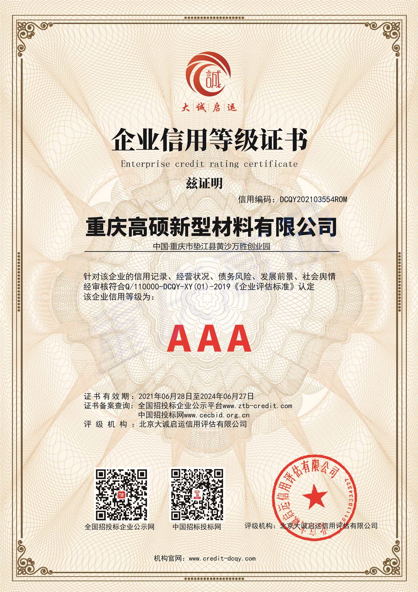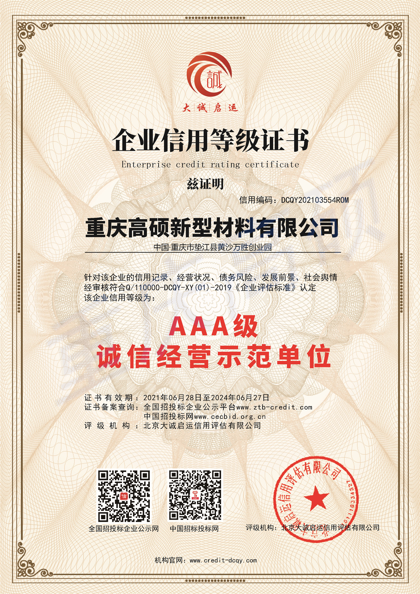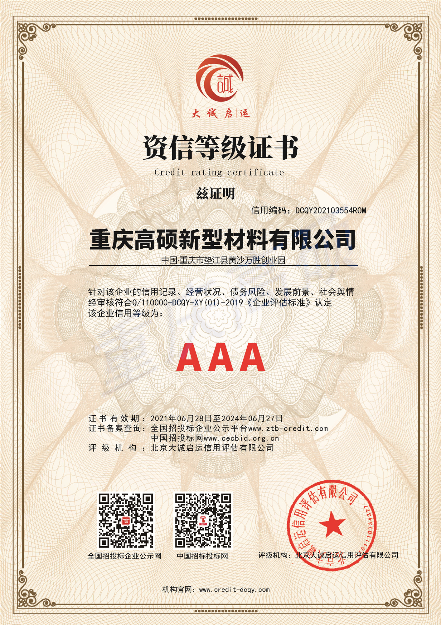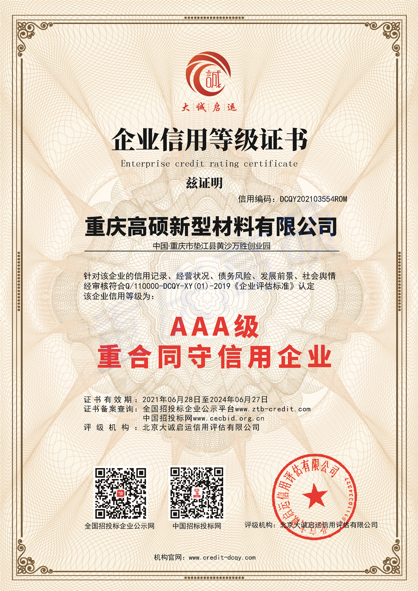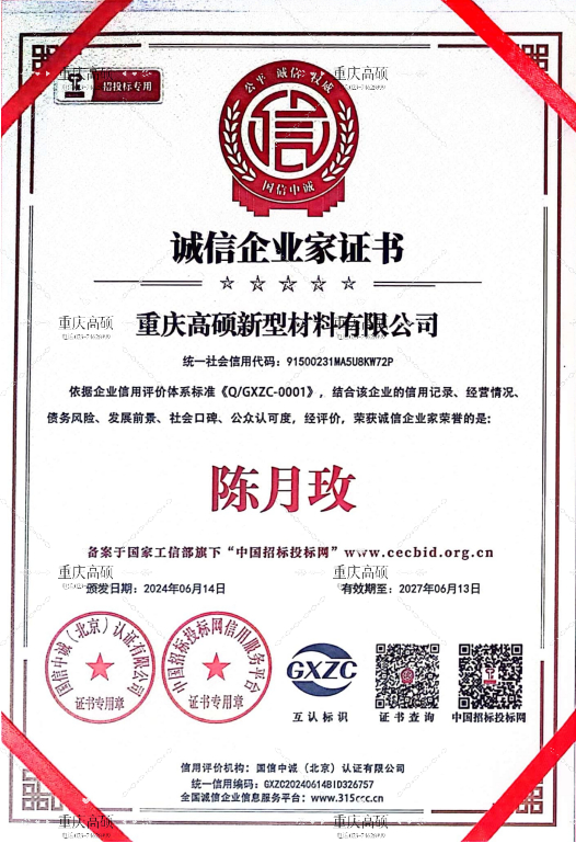 重庆高硕是中国土工合成材料工程协会理事单位,先后获得国家高新技术企业、重庆市专精特新中小型企业、质量诚信标杆企业、AAA级守合同重信用企业、AAA级企业诚信示范单位、AAA级质量服务诚信单位等荣誉,公司通过“ISO 9001:2015质量管理体系认证”、“ISO 45001:2018职业健康安全管理体系认证”、“ISO 14001:2015 环境管理体系认证”,高硕品牌享有较高的知名度和美誉度,致力于打造一流的创新、研发、设计、生产、应用资源共享平台,为广大客户提供优质的产品和全方位的售后服务以及一体化解决方案。
