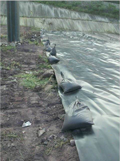 6:HDPE防渗膜铺设完成后,应尽量减少在膜面上行走、搬动工具等,凡能对HDPE膜造成危害的物件,均不应放在膜上或携带在膜上行走,以免对膜造成意外损伤。