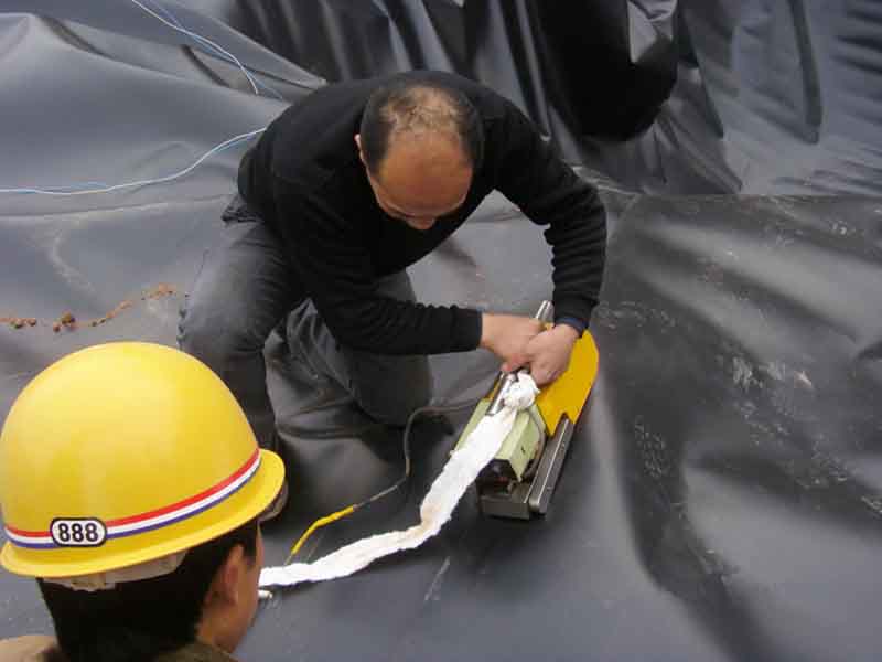 HDPE防渗膜的焊接使用楔焊机,采用双轨热熔焊接。楔焊机无法焊接的部位,应采用挤出式热熔焊机,配以与原材料同质的焊条,形成堆焊的单焊缝。