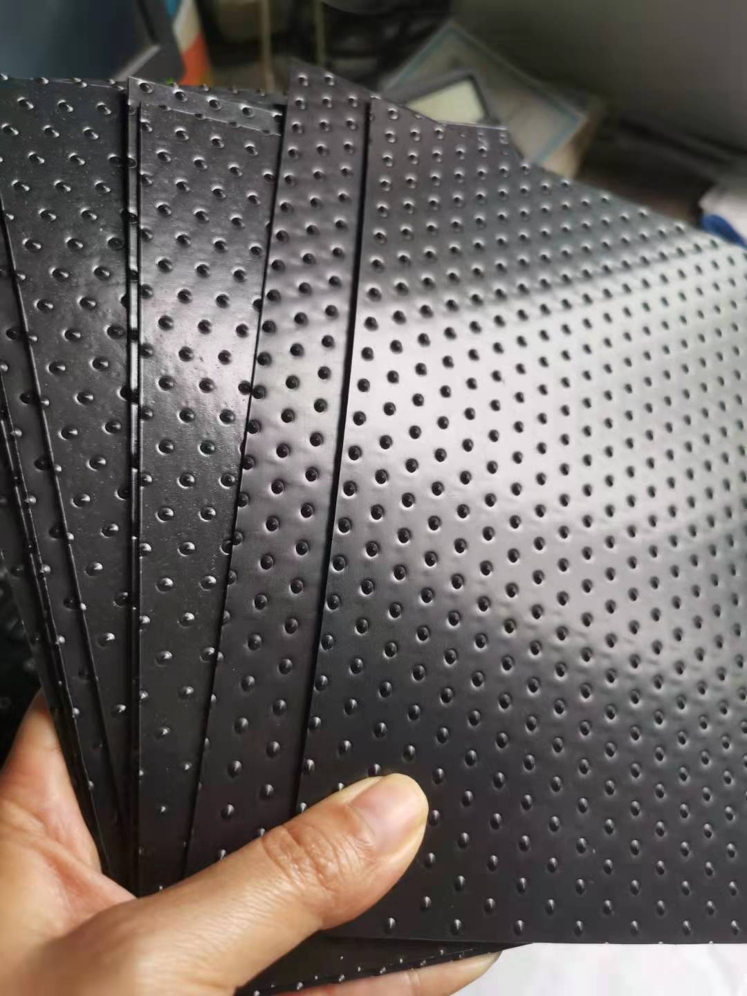 柱点土工膜是在基础板材上加上了凸起的小小柱点,这是在外观角度,看起来就是这样的。从生产工艺上来讲的话就是在板材还没有冷却成型之前,用具有凹下去的柱点压辊相互挤压冷却成型,这样就在基础板材上有了柱点凸起,形成柱点面土工膜。它的优点是能够保障相应的物理指标,也就是具有较好的质量要求指标,包括断裂强度,伸长率等等。缺点是整体的克重高了,也就是说成本价高了。
