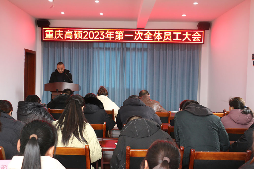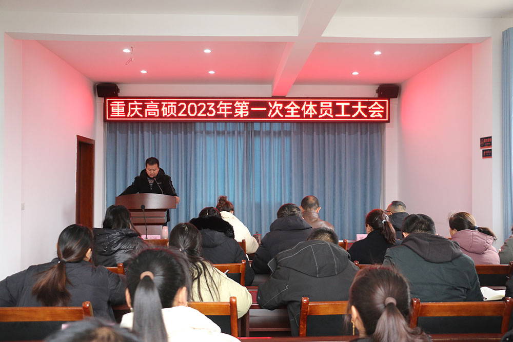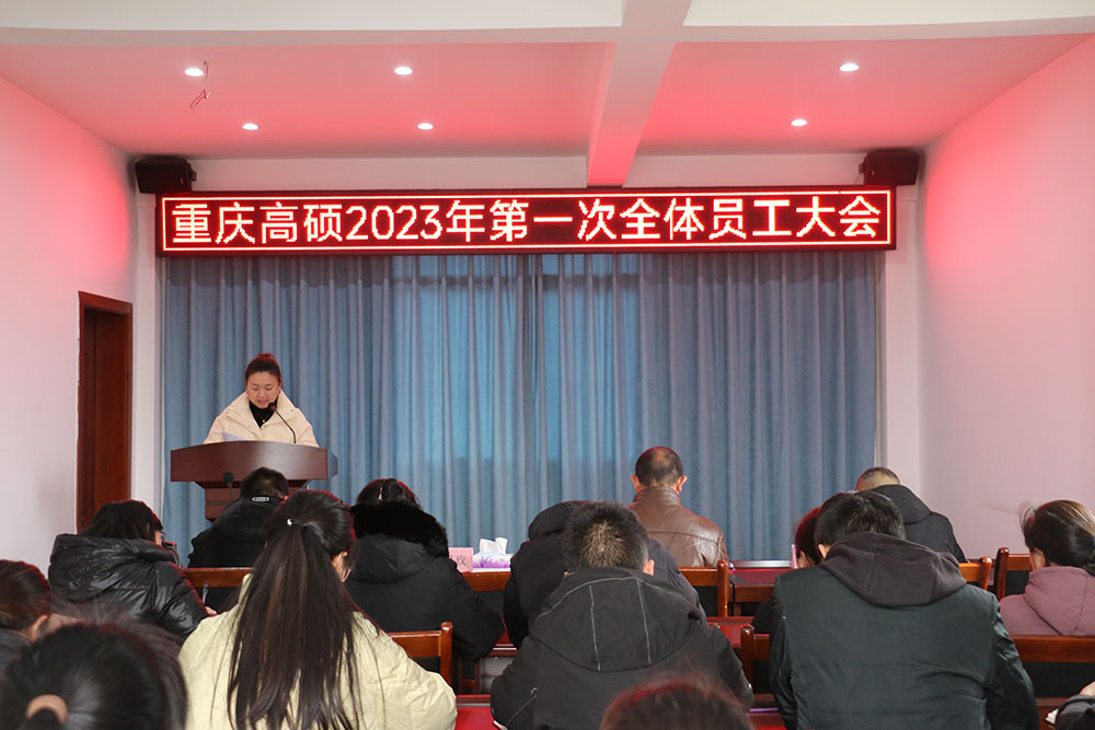 律回春晖渐,万象始更新。2月7日下午,重庆高硕2023年首届员工大会在公司二楼会议室成功召开,会议由总经办助理黄小波主持,重庆高硕总经理郭强、厂务厂务部陈吉林厂长、行政部副总经理陈月玫分别对2022年度的各项工作进行了分析与总结,并对2023年的工作予以部署。本次会议,是重庆高硕2023年度的第一场员工大会,也是产业发展的全新启航,对未来发展有着重要的意义。