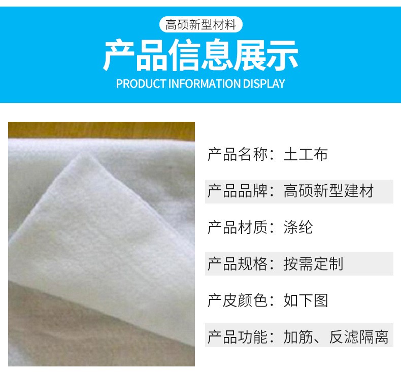 加固作用:土工布具有很高的抗拉强度和刚度,可以用于加固土体和石质体,提高其承载能力和稳定性。