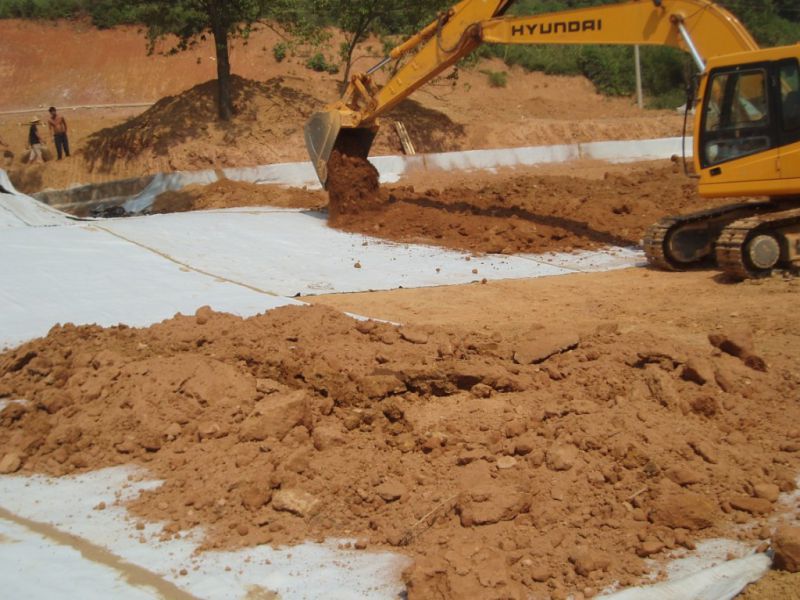 (4)铺设复合土工膜时,要选择良好的天气,严禁在雨雪天气里铺设,且要对已铺设的采取措施进行保护。