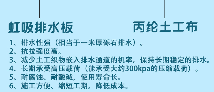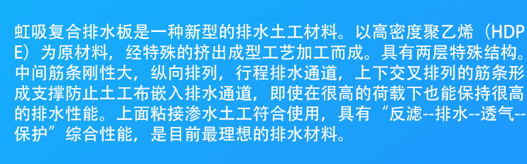 1 供给全面的柔性保护、防止防水层遭受回填土的损坏。复合防护排水异形片通过双面自粘防水(粘霸)平接。