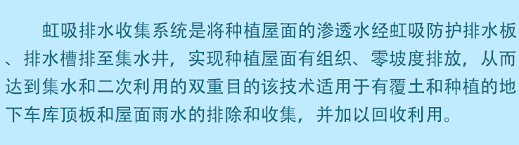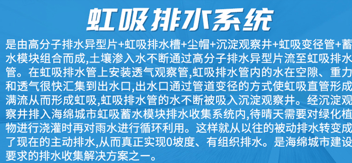 虹吸排水系统是国家建设部推广并且入编国家标准的专为屋顶绿化滤水设计,集排水、蓄水功能于一身的新型材料。它解决了传统的造景方式中排水层(如采用鹅卵石、陶粒、贝壳等作为滤水材料)不能储存水、不能有效防止植物根系破坏砼表面、不能保温隔热、载荷大等缺点,同时具备结构蓄水、排水、透气、保温、隔热和防根刺等六大突出功能,是传统滤水材料的良好替代品。