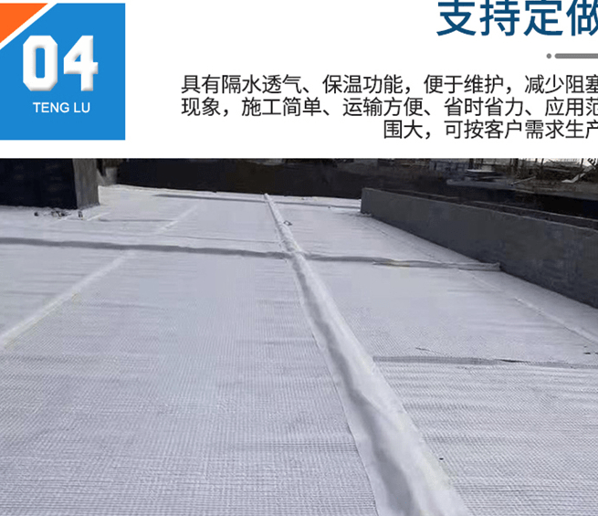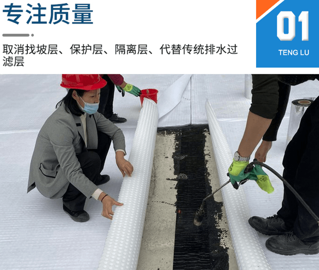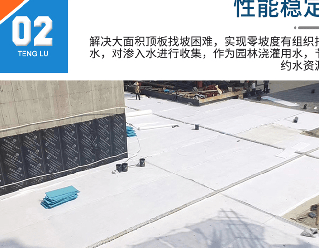产品主要由高分子防护排(蓄)水异形片、自粘土工布、虹吸排水槽、PP蓄水池(蓄水模块)、粘霸、透气观察井等组成,结合土工布或加筋保护垫一起使用,可以避免细颗粒基质堵塞蓄水槽和排水通道,保持排水通畅和空气流通,形成一个完整的新型蓄排水系统。本产品广泛应用在地下工程顶板和屋顶绿化等工程部位,不但减轻了顶板和屋面荷载,还降低了工程造价,并且施工简单。
